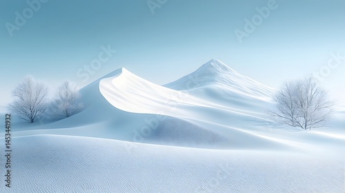 mountain, dune, tree, snow, cover, racked, bare, minimalist, clean, white, soft, peaceful, calm, cold, winter, morning, day, outdoors, landscape, background, print, wallpaper, surface, texture, scene, nature, sand, sky, hill, tree branch, horizon, minimalism, still, blue, environment, season, frost, snowy, weather, scenic, imagery, design
