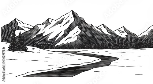 mountain, river, landscape, winter, snow, illustration, greyscale, minimalist, nature, drawing, vignetting, black-and-white, scene, vale, tree, forest, creek, snow-capped, alpine, peak, line art, scenic, cold, calm, serene, winter scene, artwork, poster, background, graphic, vector, isolated