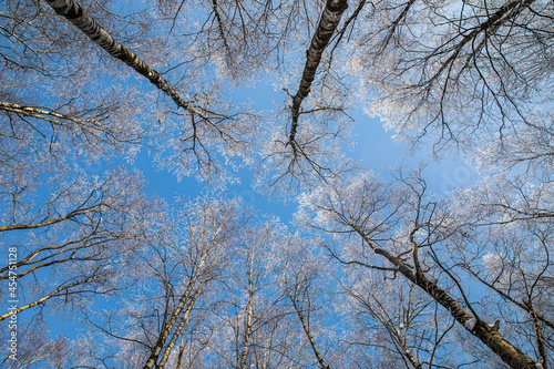 winter natural landscape view from below on the crowns and tops of birch trees covered with white frost against the blue sky in the Park