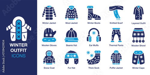Winter Outfit icon set. Containing coat, wear, beautiful, autumn, trendy, and more. Solid vector icons collection. Vector illustration.