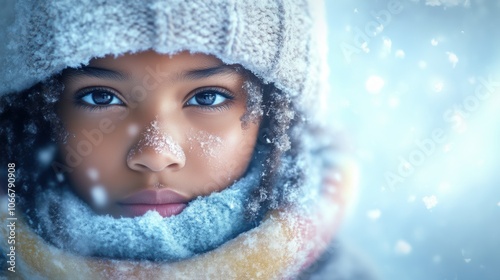 winter, girl, snow, lass, copy space, serenity, young, cosy, outfit, snowfall, closeup, expression, cold, season, beauty, peaceful, children, warmth, glacé, face, eye, hat, foulard, frosty, calm, wonder, innocence, childhood, weather, ice, chill, festive, wool, knit up, scenery, tranquil, atmosphere, fluffy