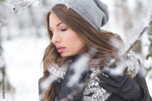 Winter portrait of beautiful brunette woman in park