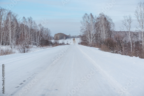 Winter road. Ride through the winter forest. Snow fell in the forest. Road through the snow.