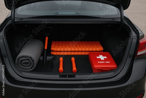 blanket, shovel, flare, first aid, preparedness, snow, ice, travel, road, organisation, checklist, copy space, cold weather, gear, equipment, transport, jan, automotive, minimal, 2025, practical, layout, utility, prevention, security, roadside