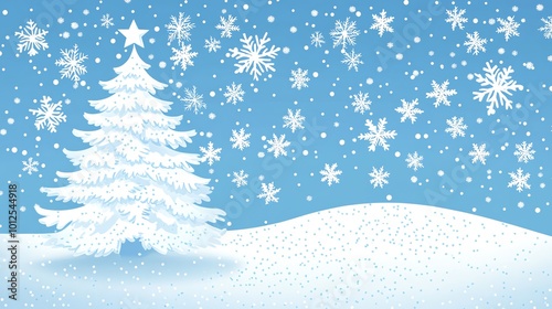 Winter scene with a snowy tree and falling snowflakes on a blue background, capturing the essence of the season.