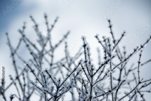 Winter scenery, frozen branches close up.