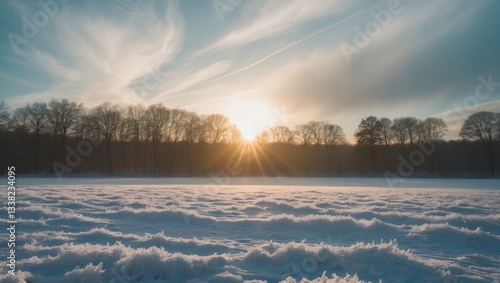 Winter scenery, snow-covered landscape, natural environment, sun.