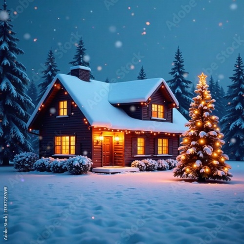 Winter snow-covered house with festive lights and Christmas tree, winter, furniture, holiday