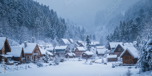 Winter Snow-covered Village at Night with Warm Glowing Lights
