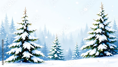 Winter snowy forest landscape showcasing tall trees blanketed in fresh snow, creating a serene, cold, and peaceful atmosphere perfect for seasonal and winter-themed visuals.