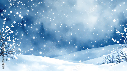 Winter snowy landscape watercolor with Xmas tree and house, background for Christmas, new year and winter season festival poster illustration.