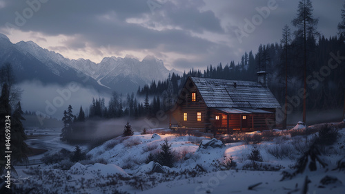 Winter Solitude: A Cinematic Shot of a Log Cabin in the Woods