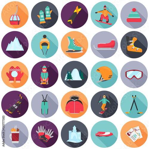 winter, cold, snow, frost, entertainment, sport, fun, season, time, signs, symbol, flat, icon, vector, object, isolated, shadow, colours, colourful, game, ice, castle, lift, jacket, hat, bobsleigh, glove, ski, skate, shoe, mountain, sled, snowboard, puck, hockey stick, hockey, set, goggles