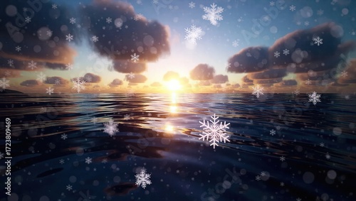 sunset, ocean, winter, snowflake, snow, calm, water, beautiful, serene, nature, sky, cloud, falling, cold, wintery, tranquil, dramatic, artistic, digital, graphic, illustration, peaceful, evening, horizon, light, warm, cool, dark, ambient, atmosphere, design, holiday, december, jan, february, new year, christmas, background, wallpaper