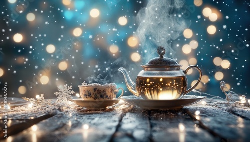 winter, tea, teapot, cup, snow, christmas, light, cosy, warm, holiday, festive, bokeh, background, drink, beverage, hot, steam, magical, romantic, relaxing, comfort, winter landscape, snowflake, serenity, calmness, celebration, festive season, tea-party, wooden table, illuminated, glowing, lichterkette, sparkly, winter scene, calm, peaceful, christmas lights, lifestyle, corporate, learning, marketing, payment
