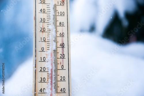 Winter time. thermometer on snow shows low temperatures in celsius or fahreneheit.