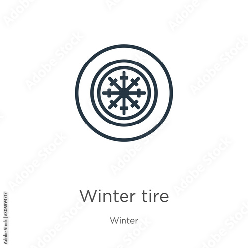 Winter tire icon. Thin linear winter tire outline icon isolated on white background from winter collection. Line vector winter tire sign, symbol for web and mobile