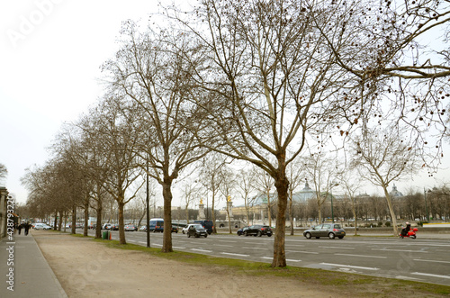 Winter tree bare on the side of Avenue des Champs-Elysees on a quiet day