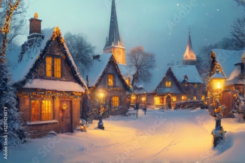 christmas, snow, village, winter, cold, nature, white, house, season, tree, night, house, thatched, roof, chimney, light, garland, warm, cosy, atmosphere, church, church steeple, clock, tower, sky, snowflake, peaceful, serene, colours, palette, blue, orange, yellow, festive, magical, scene, beautiful