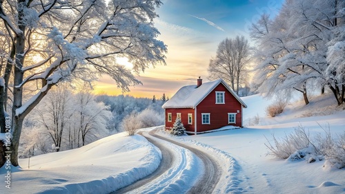 Winter Wonderland A Scenic Red Cottage Nestled on a Snow-Covered Hillside with a Winding Road at Sunrise