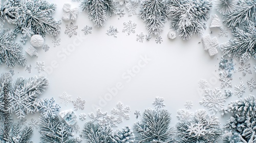 Winter Wonderland Background with Fresh Green Pine Branches, Snowflakes, and Decorative Elements for Holiday Crafts and Celebrations in a Serene Atmosphere