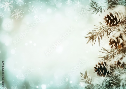 Winter Wonderland Background with Pine Cones and Snowy Fir Branches on a Soft Blurred Teal and White Bokeh Effect for Holiday Decor and Invitation Designs