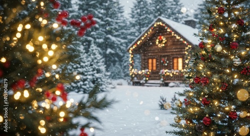 Winter Wonderland Cabin - A cozy log cabin decorated for Christmas sits in a snowy forest, surrounded by twinkling lights and decorated trees