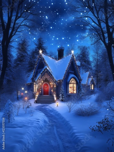 Winter Wonderland Cozy Cottage Scene - A charming cottage covered in snow illuminates a peaceful winter night under a starry sky, creating a magical holiday atmosphere.