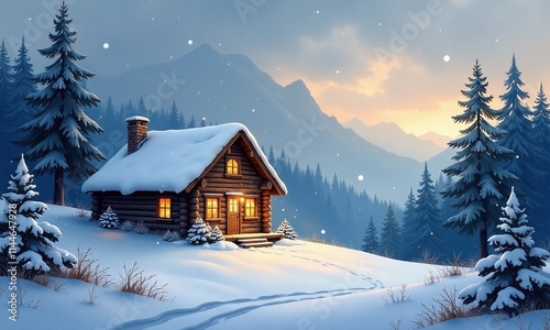 Winter wonderland cozy log cabin snowy forest atmospheric