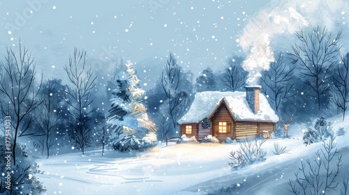 winter wonderland, enchanting sketch of a winter cabin in a snowy forest, chimney smoke rising, a reindeer peeking out, creating a heartwarming christmas scene