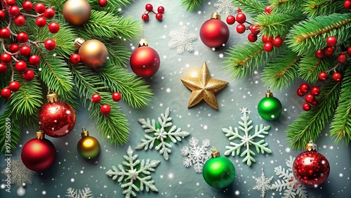 Winter wonderland scene features delicate snowflakes gently falling around a vibrant Christmas tree adorned with red and green ornaments, mistletoe, and a hint of festive cheer.