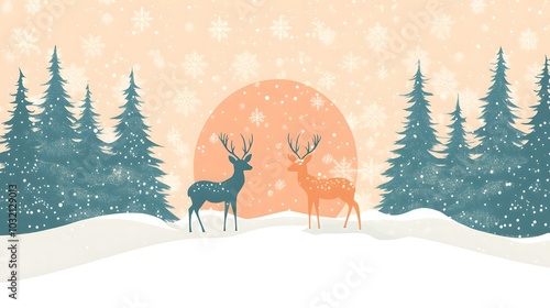 winter, snow, cervid, forest, tree, pine, fir, couple, love, romance, nature, landscape, season, holiday, christmas, new year, glacé, cold, frost, white, blue, green, orange, sunset, sunrise, background, graphic, design, illustration, digital artwork, peaceful, serene, magical, whimsical, aesthetic, elegant, minimalist