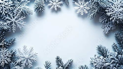Winter-themed frame of snowflakes and evergreen branches on a light background, perfect for seasonal greetings