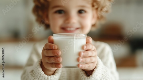 With a genuine smile, a young child holds a glass of fresh milk joyfully in a home environment, conveying warmth, happiness, and healthy living.