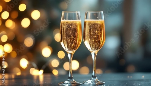 wo flutes of golden champagne with tiny bubbles rising, elegantly placed on a table with a bokeh background of twinkling fairy lights. Stock photography 32K, UHD, Ultra HD quality, high quality