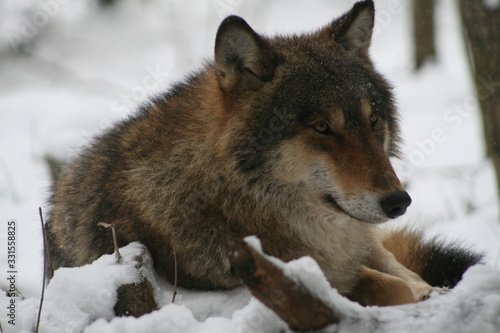 Wolf in snow winter pine forest with a man