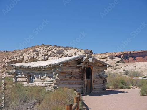 Wolfe Ranch old historical log cabin famous location and desert landscape of Arches National Park