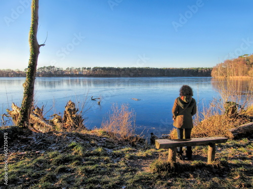 woltersdorf, deutschland - frau am ufer vom flakensee im winter