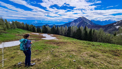 Woman admiring the scenic view near Frauenkogel on the mountain peaks in the Karawanks, Carinthia, Austria. Borders Austria, Slovenia, Italy. Triglav National Park. Looking on Kahlkogel (Golica).