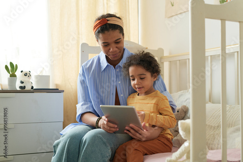 Woman and child sitting together on bed, using tablet in cozy bedroom setting, spending quality time and sharing learning experience