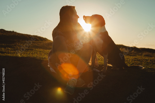 woman, dog, hill, face to face, sunset, sitting, sky, scenic, nature, lifestyle, silhouette, avocation, lens flare, orange, full-length, care, get-away, friendship, sunlight, animal, bonding, pet, vacation, sunbeam, destination, relaxation, backlit, tranquil scene, remote, recreation, mammal, calmness, love, one animal, loyalty, torres, brazil, outdoors, one person, young adult, missy, female
