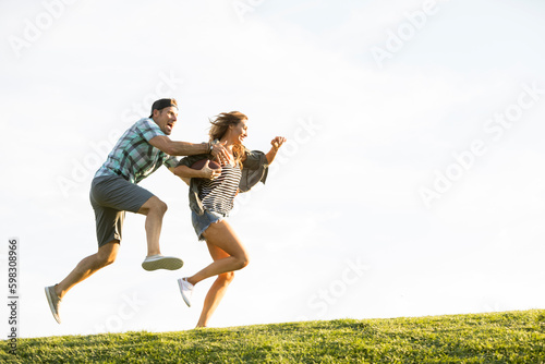 young adult, young men, caucasian, togetherness, avocation, bonding, summer, enjoyment, outdoors, day, public park, hill, running, motion, vitality, horizontal, two people
