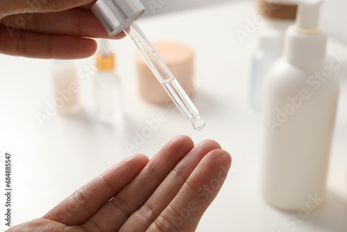 Woman applying cosmetic serum onto her finger at white table, closeup