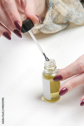 Woman applying cuticle oil on the nails. Hand skin care at home with moisturizing oil. Beauty, style, makeup, fashion, lifestyle concept.