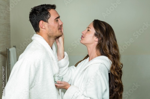 Woman applying moisturizer on man’s face