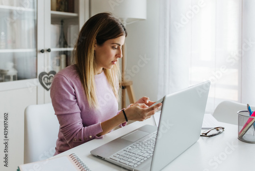 adult, apartment, attractive, beautiful, beautiful woman, beauty, business, businesswoman, casual attire, caucasian, communication, computer, connection, copy space, desk, domestic life, entrepreneur, female, freelance, freelancer, girl, happy, home, home interior, home office, homework, indoor, cyberspace, job, laptop, lifestyle, living room, modern, networking, notebook, one person, online, person, phone, portrait, pretty, professional occupation, room, smartphone, table, technology, telecommuting, telework, telecommuting, using, wireless, wireless technology, woman, work, working, workplace, young, young adult, missy
