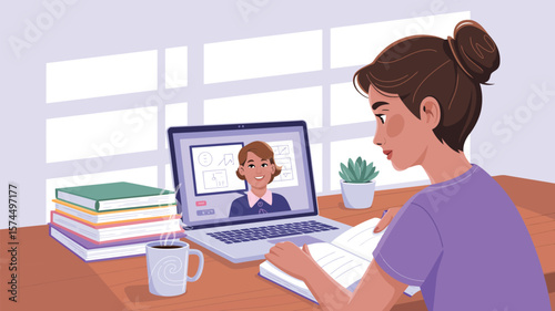 Woman attends an online class with laptop, books, and coffee on a wooden desk near window