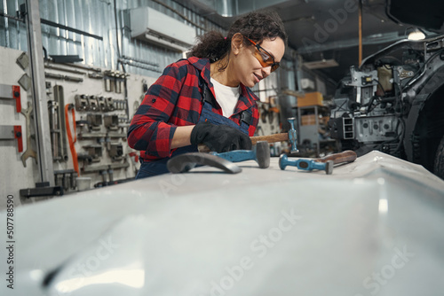 mechanic, woman, automobile, auto, repair, work, service, car, hammer, machine, garage, station, vehicle, equipment, specialist, tool, mechanical, professional, caucasian, female, workshop, transport, men at work, person, automotive, metal, maintenance, job, occupation, indoor, human, machinery, diagnostic, profession, technician, concept, industry, transportation, adult, industrial, people, mender, master, goggles, safety, production, manufacturing