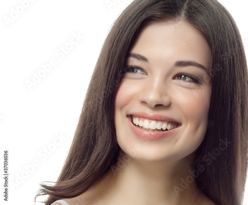 attractive, beautiful, beauty, female, girl, happiness, happy, joy, lady, model, person, portrait, pretty, toothy smile, smiling, studio, white, woman, young, adult, isolated on white, face, skin, health, teeth, make-up, cosmetic, spa, care, brunette, long, hair