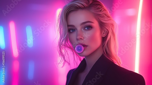 woman, bubble, gum, neon, light, portrait, beauty, style, fashion, expression, colours, hair, make-up, cool, vibrant, artistic, photo, urban, chic, confidence, youth, playful, trendy, modern, allure, glow, creative, scene, atmosphere, mood, elegance, charisma, striking, dynamic, background, smile, fun, energy, pose, captivating, stylish, aesthetic, glamour, brightness, nightlife